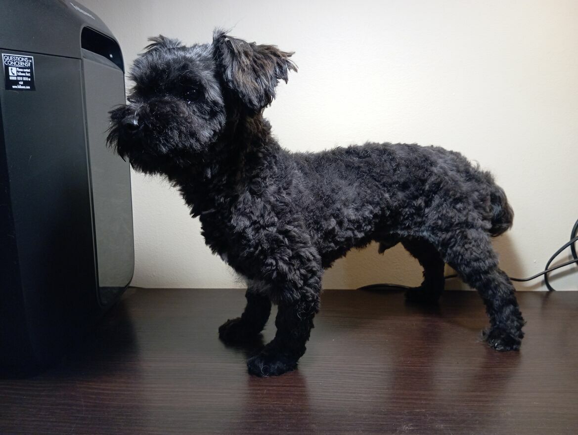 Piesek jest o ubarwieniu czarnym z maleńkim znaczeniem białym.